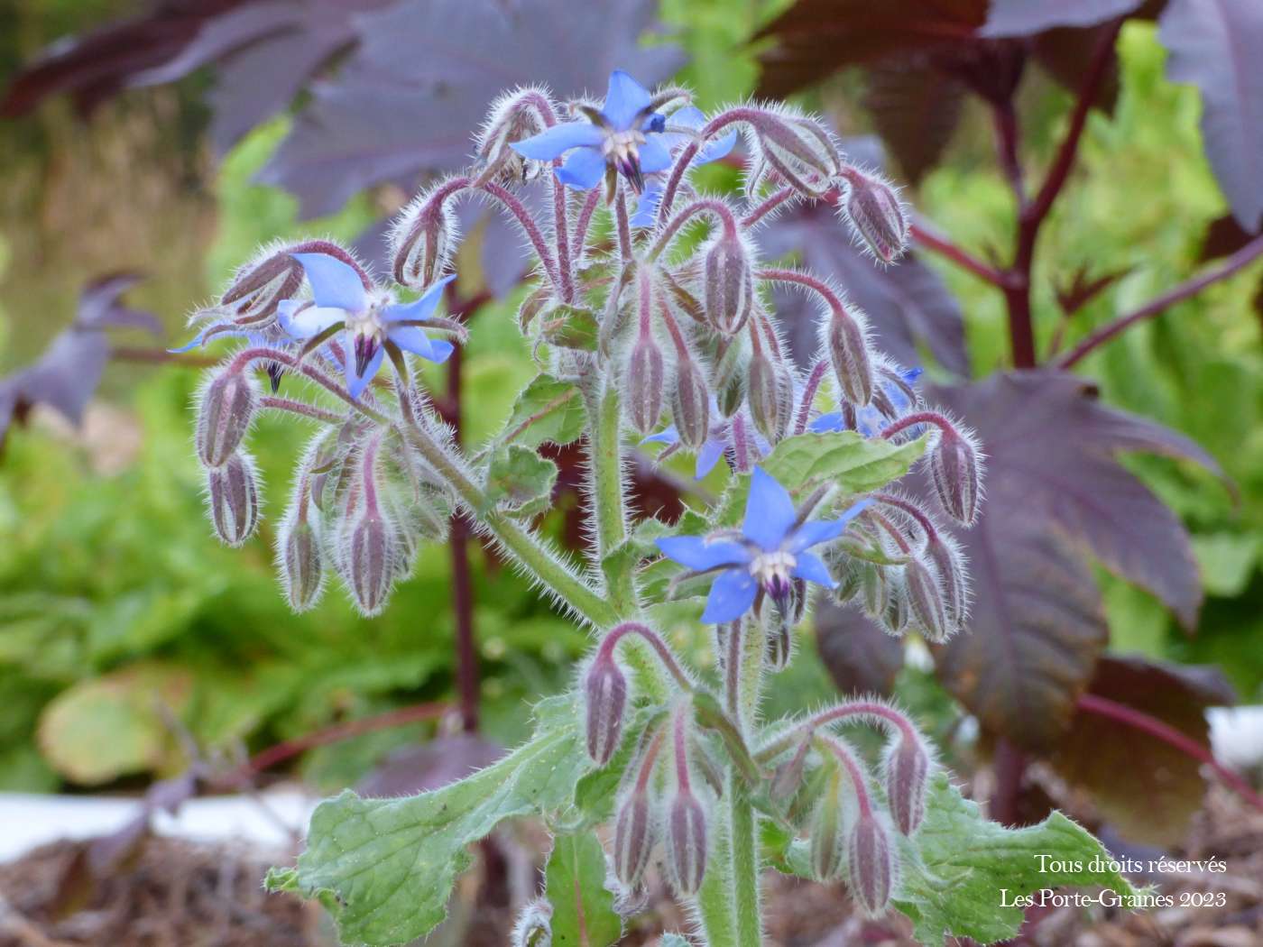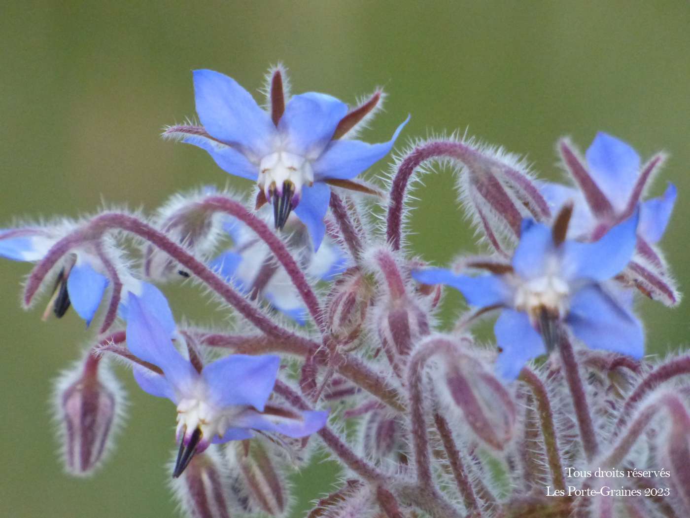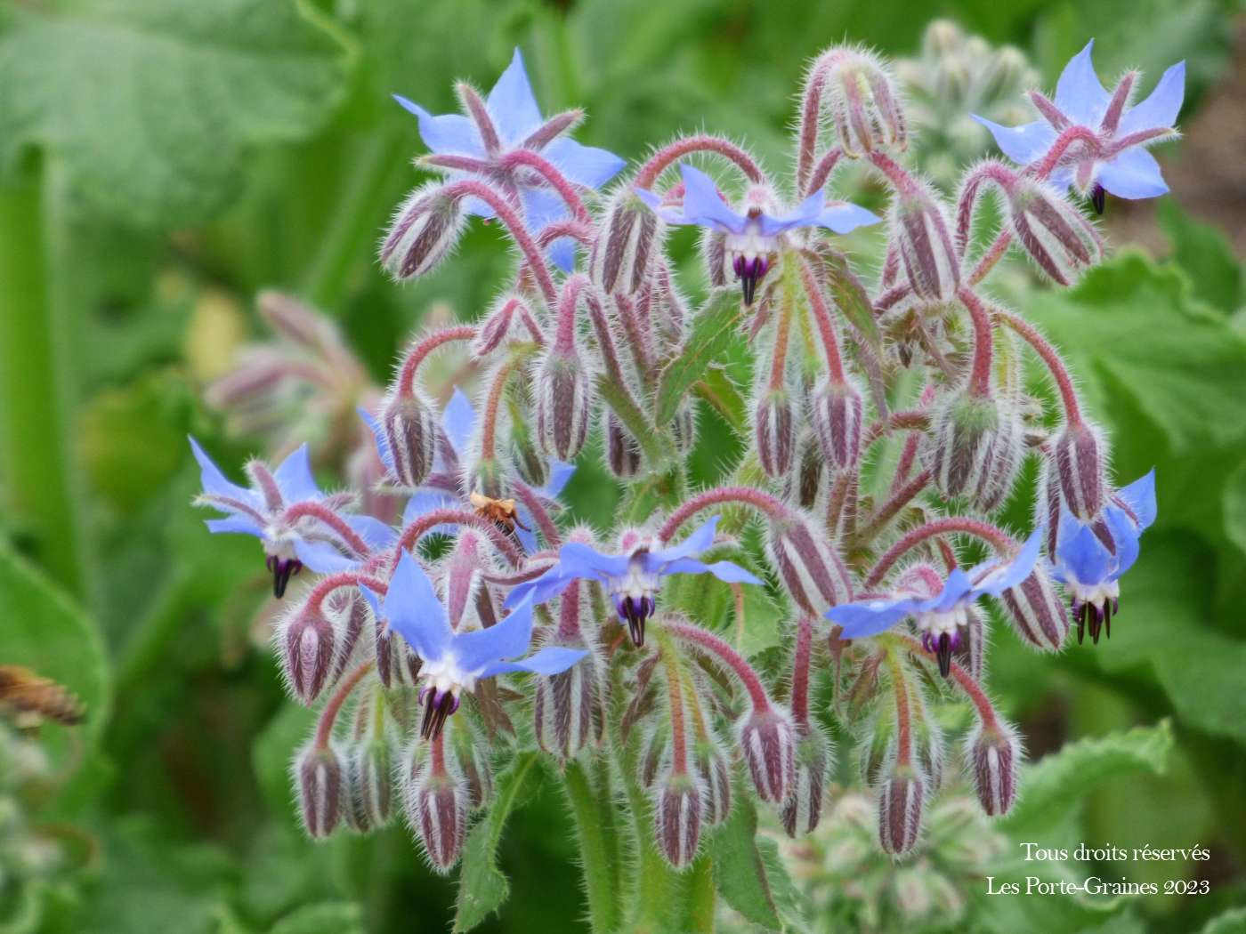 Bourrache bleue - Abu rach - Borage - Cool tankard - Starflower - Tailwort, talewort. Noms botaniques précédents : Borago advena - Borago aspera - Borago hortensis