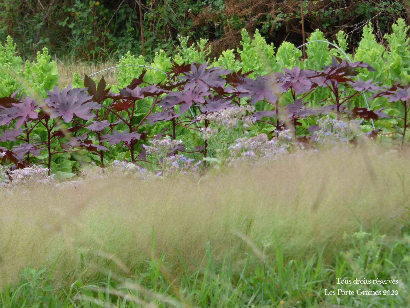 Le Ricinus communis 'New Zealand Purple' est une grande plante très graphique et structurante, habillée de larges feuilles pourpre-violacé qui se parent de reflets bleutés en fonction de l'heure… > lire la suite