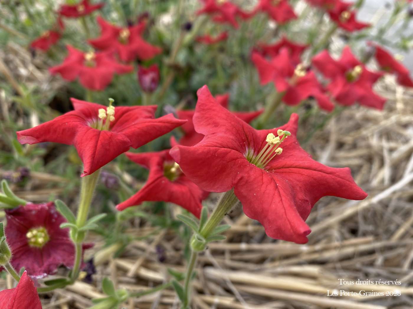Espèce botanique en voie d'extinction dans son milieu naturel, le Petunia exserta se pare du début de l'été jusqu'aux premières gelées d'une floraison pourpre exceptionnelle, en forme d'étoile, extrêmement abondante, qui sera parfaitement à son avantage dans une potée suspendue.