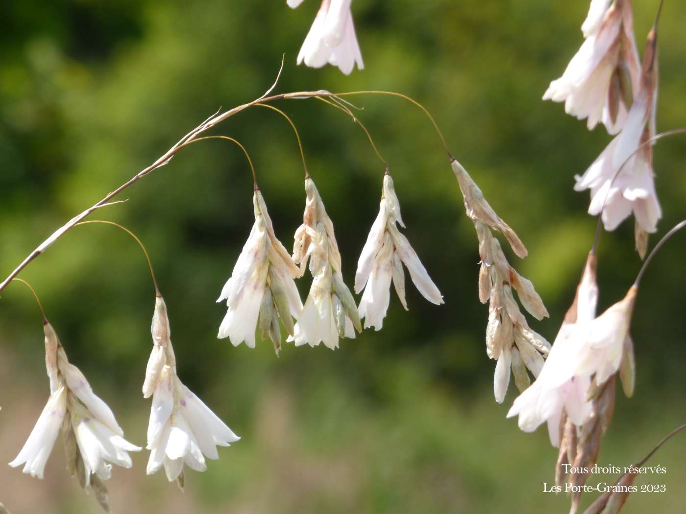 Espèce botanique rare de Canne à Pêche des Anges. Floraison blanche à rose pâle d'une grande élégance. Le dierama argyreum fleurit la deuxième ou troisième année aprés plantation. Cutlure en pot possible. Pour sols frais et drainants. Rusticité -10°C.