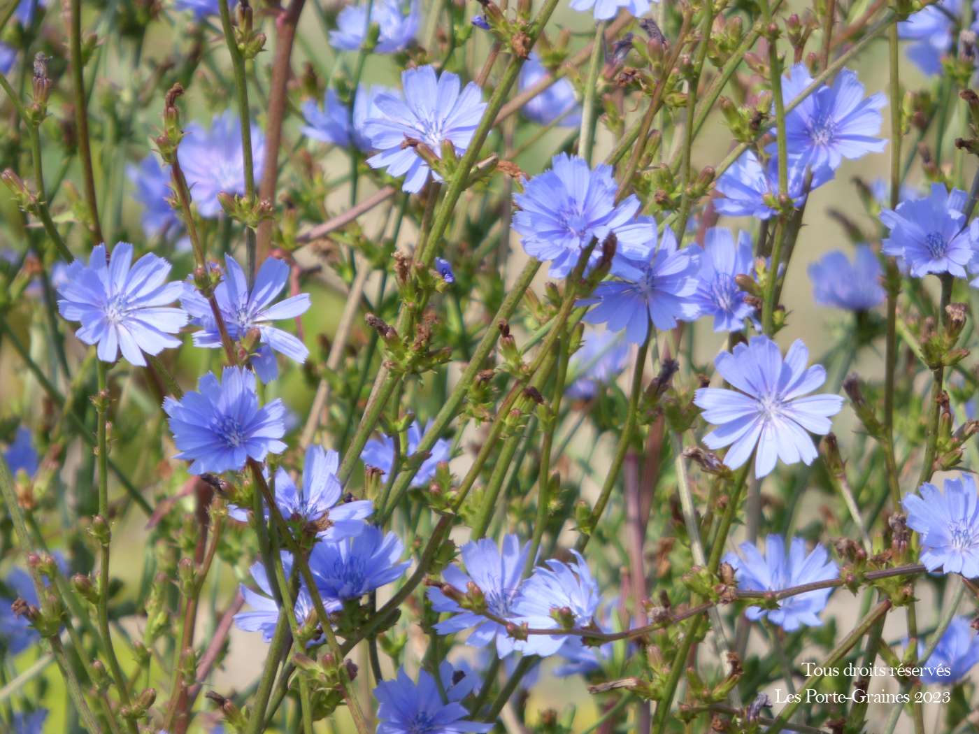 La chicorée sauvage (Cichorium intybus) est une fleur vivace bleue très rustique, adaptée aux sols pauvres et aux jardins secs. Facile à semer, comestible et mellifère, elle est idéale pour les prairies fleuries et les jardins naturels. Floraison : juin à septembre - Rusticité : -45°C.