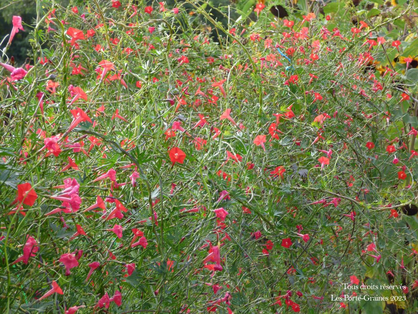 L'Ipomée quamoclit est une plante grimpante originale qui se pare pendant tout l'été d'une multitude de petites fleurs pourpres chatoyantes constellant un feuillage vert tendre particulièrement esthétique.